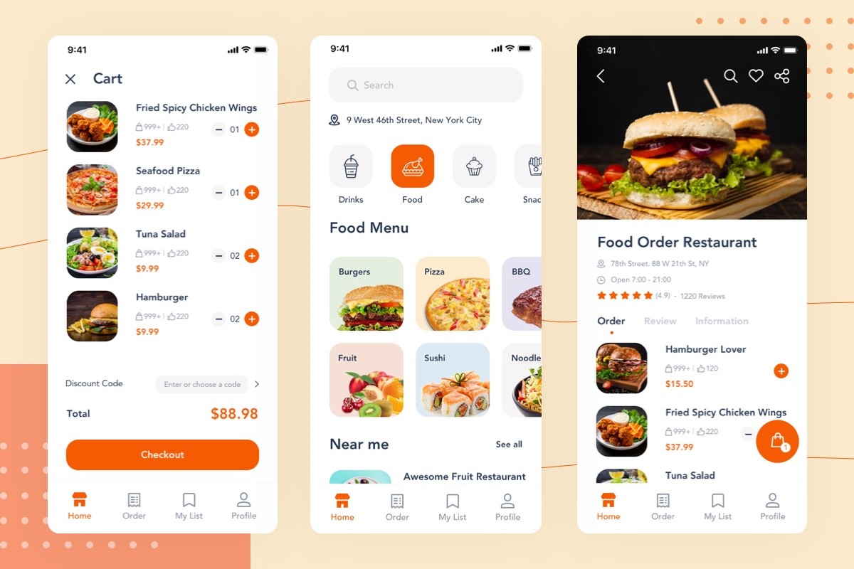 Full-featured food delivery app with restaurant listing, cart, and live order tracking.